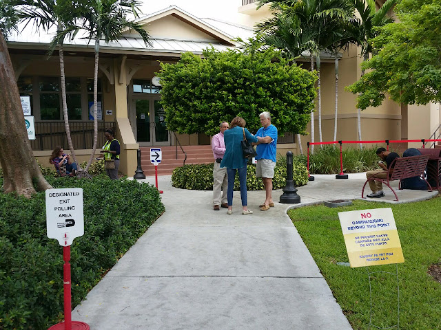 What is Vice Mayor John Dubois talking about: "What did you have for dinner, How are the kids, Vote for me?" We don't know what is being discussed -- irrelevant -- people should not be talking to a candidate this close to the polling location. A candidate should know this.